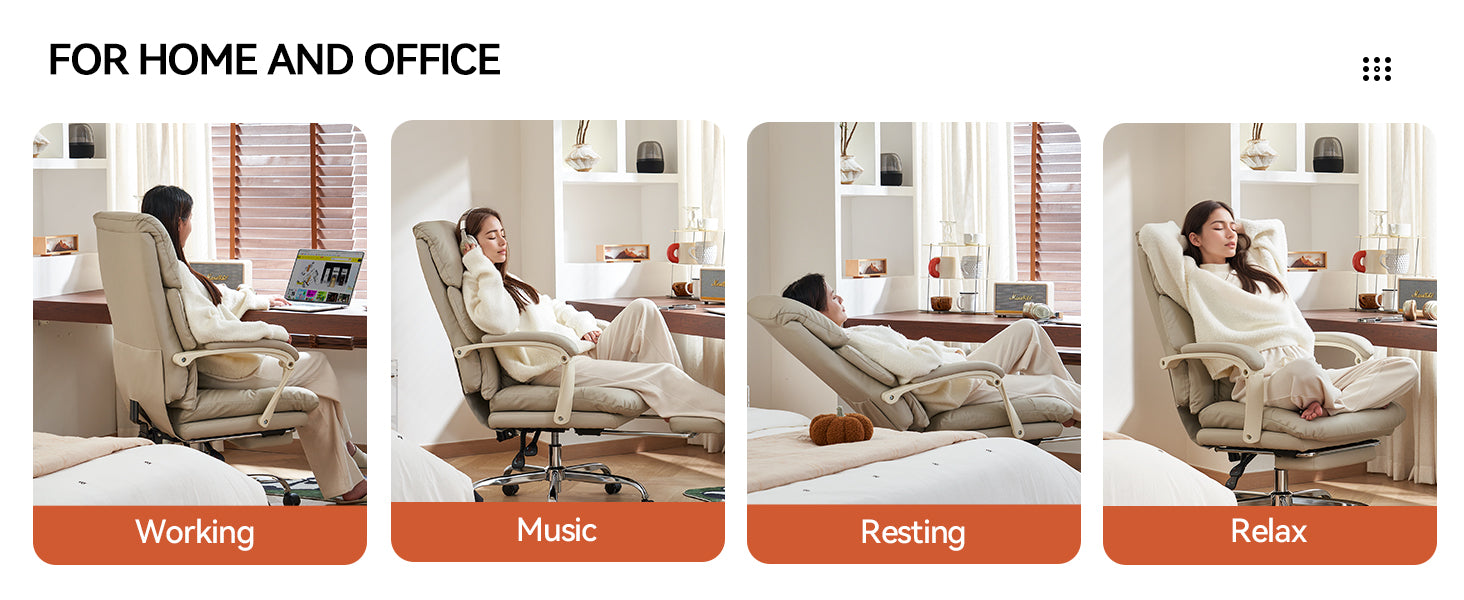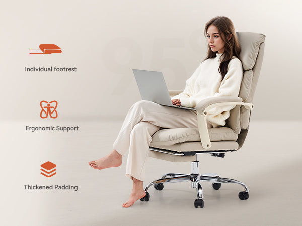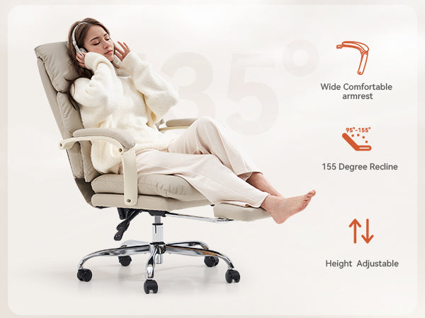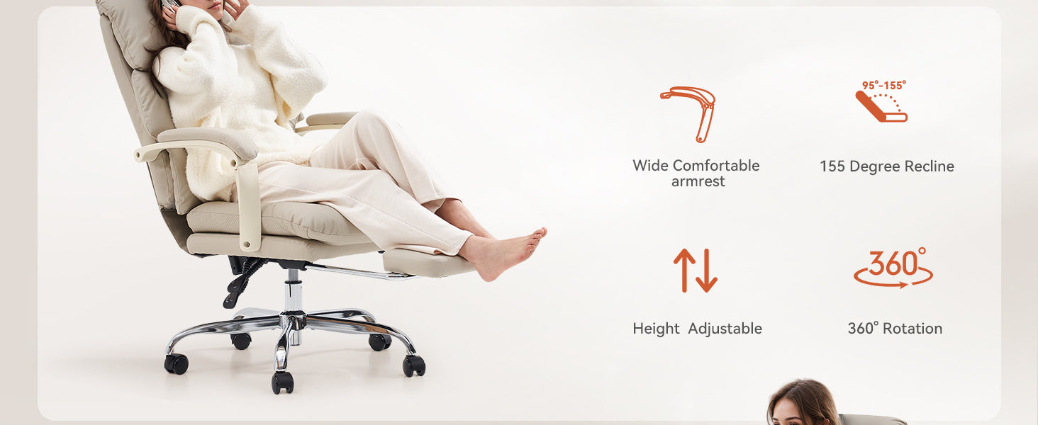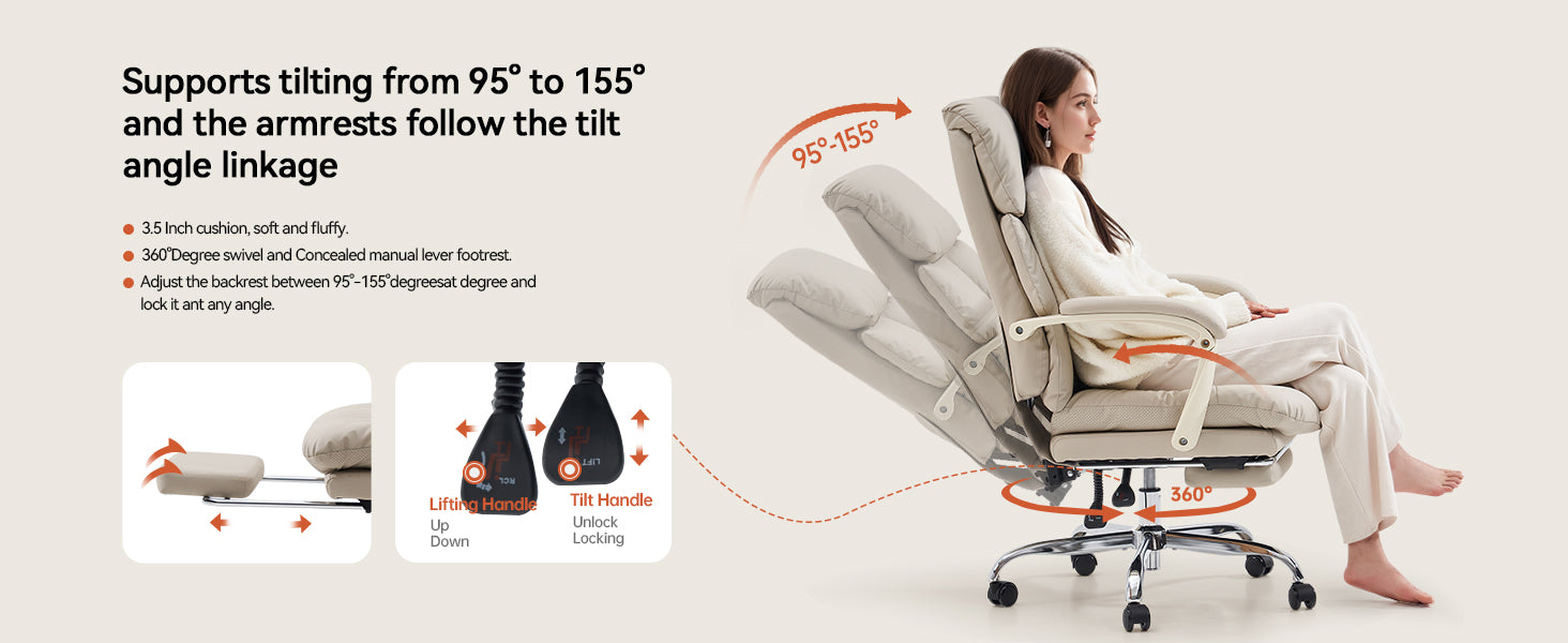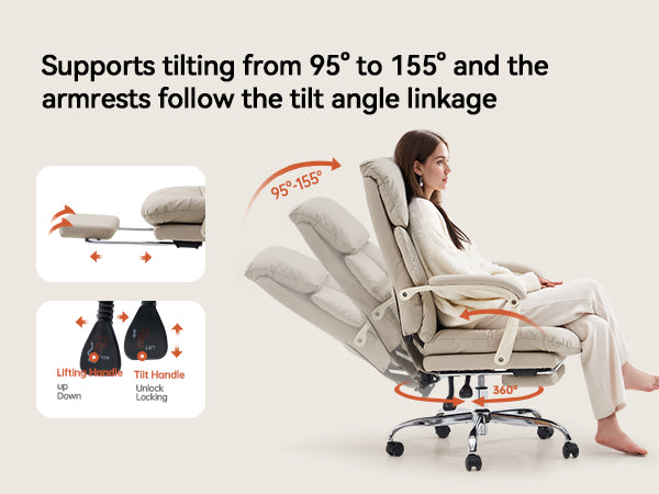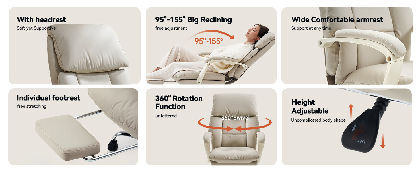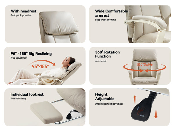 - 🛋 155° Full Recline: Backrest adjustable from 95°–155° with retractable footrest for work, relaxation, or nap mode.