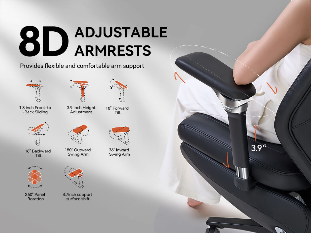 Fully adjustable armrests adapt to different body types and working or relaxing scenarios.